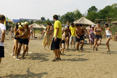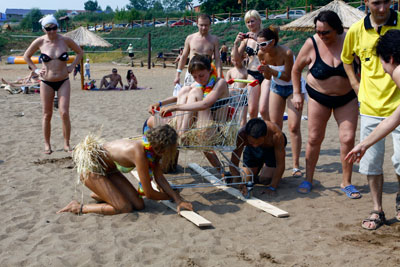Часто ли вы ходите в супермаркет? А через пляж? Трудно тащить тележку по песку? Именно такая была поставлена нашим героем задача, далась она нелегко. Для того чтобы команды все-таки доехали, им в помощь дали «рельсы» - по 4 дощечки, но за это они должны были посадить одного из участников в корзину. В течении 5 минут команды в поту преодолевали десятиметровый рубеж, участники отдыхающие в тележке успевали ещё и петь детскую песенку «Чунга-чанга».